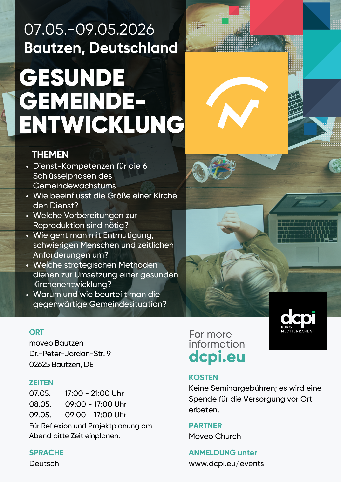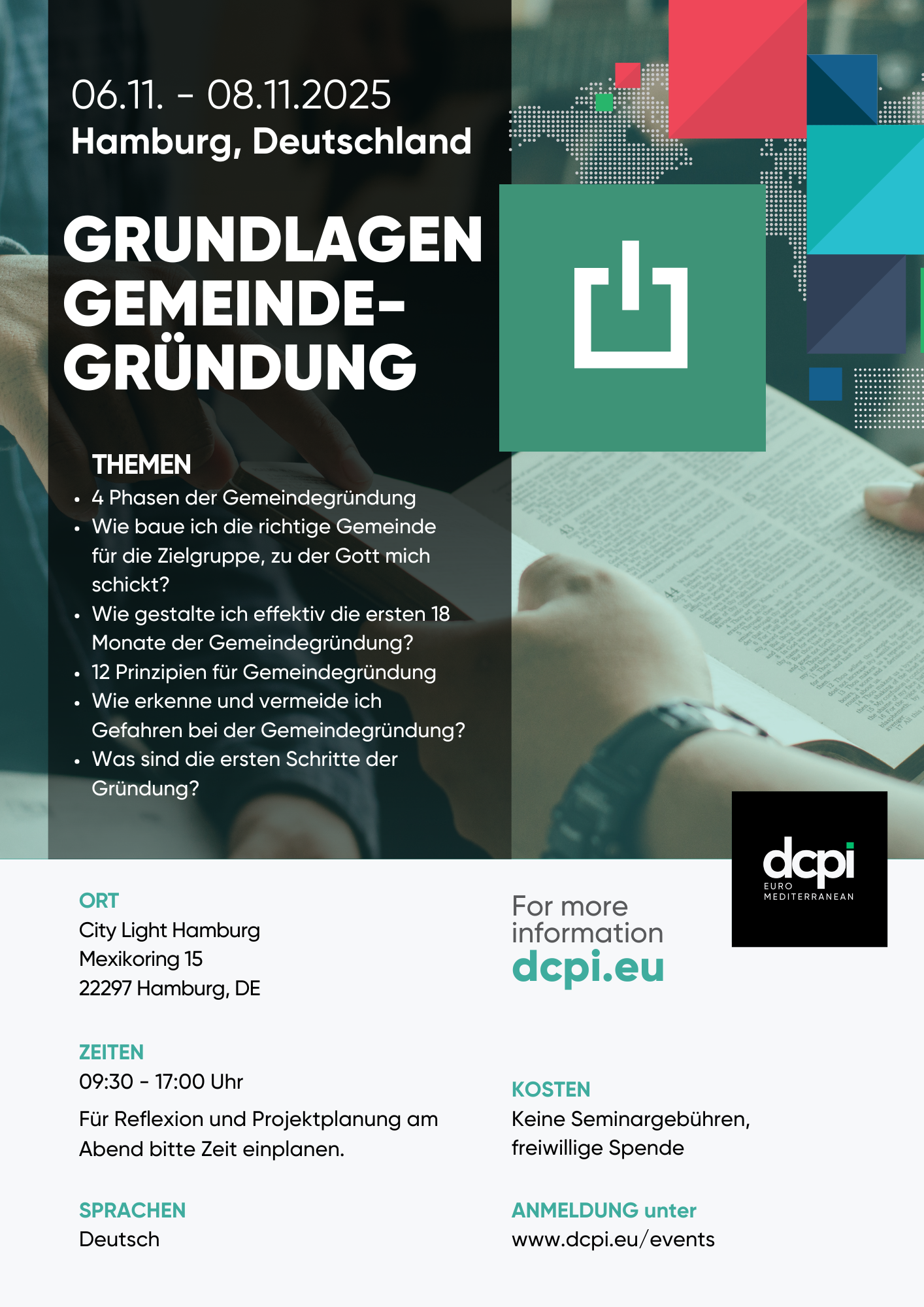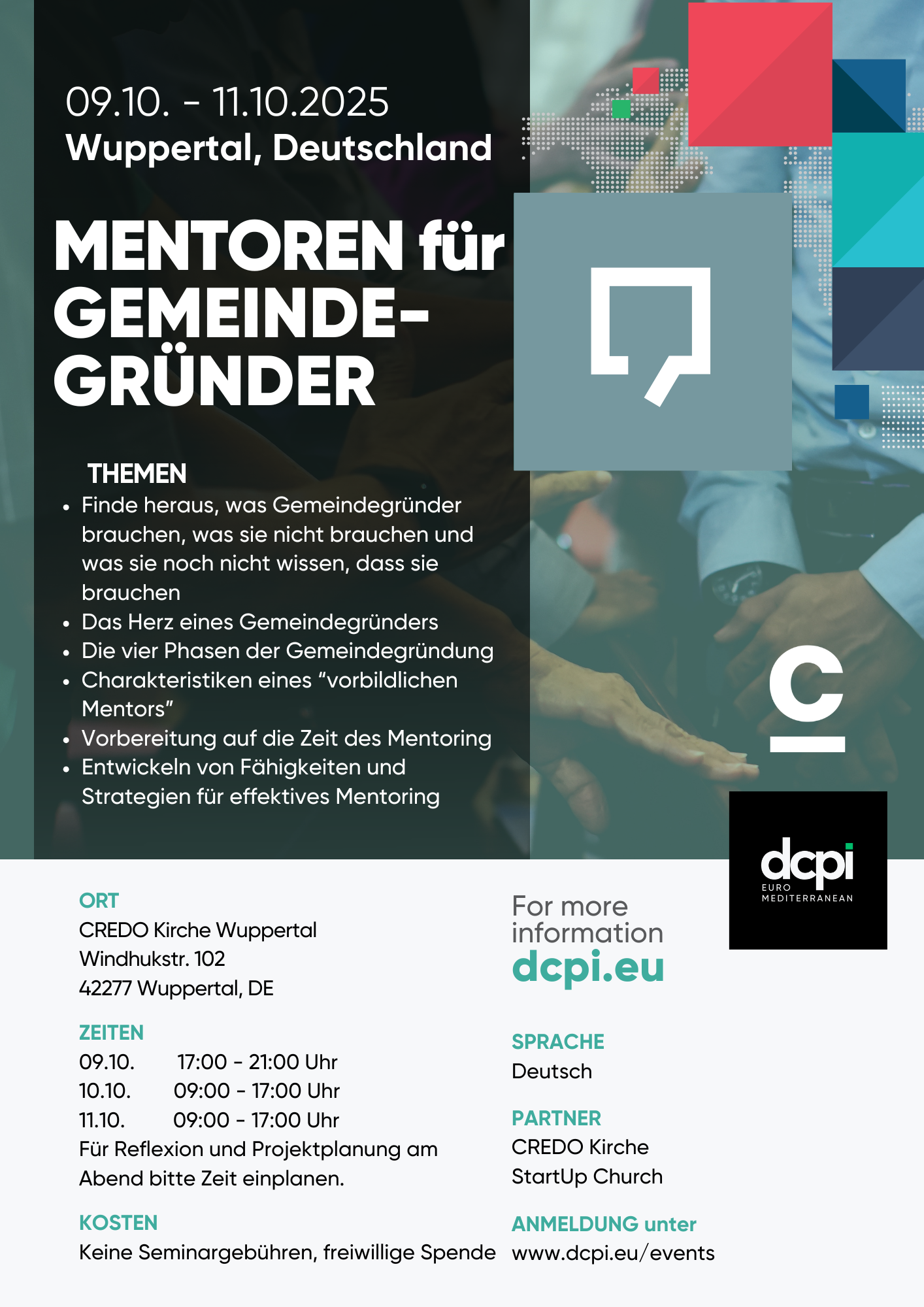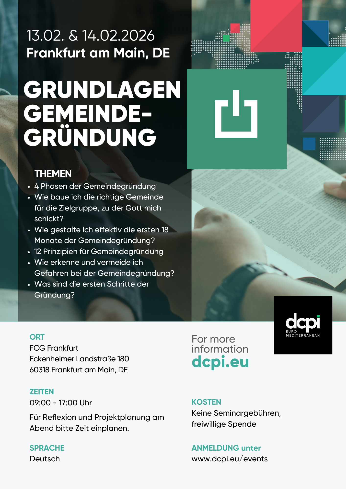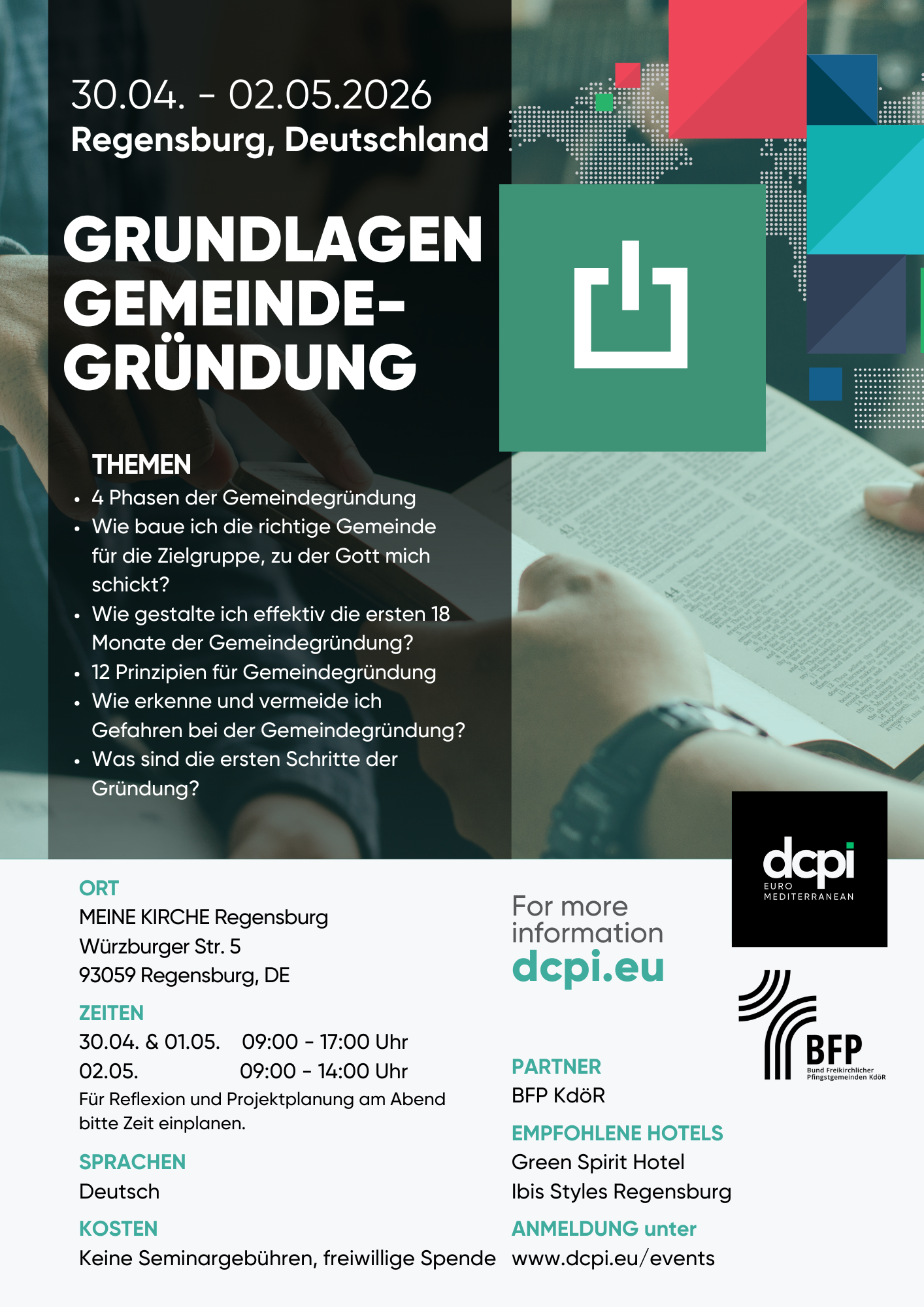 Mit Dynamic Church Planting International (DCPI) sind wir eine strategische Zusammenarbeit eingegangen, um uns besonders im Bereich Schulung und Training neu und verbessert zu positionieren. Das bedeutet, dass wir als StartUp Church (Gemeindegründungswerk des BFP) Trainings in den verschiedenen Regionen in Nord-, Zentral- und Süddeutschland durchführen, sowie am TSE und in der AIG-Ausbildung. DCPI bietet verschiedene zielgruppenspezifische Trainings zu den verschiedenen Themenbereichen bzgl. Gemeindegründung an, berät Netzwerke und trainiert seit über 20 Jahren weltweit Leiter und Gründer auf allen Ebenen, um effektiv dynamische Gemeinden zu gründen, die wiederum die Welt für Jesus Christus erreichen.